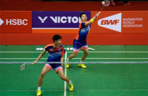 National men's doubles aaron chia (l) and soh wooi yik (r) at the 2019 malaysia masters badminton championship.